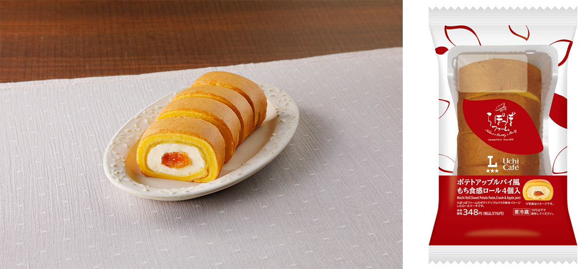 らぽっぽファームの一番人気商品「焼きたてポテトアップルパイ」とローソン人気スイーツ「もち食感ロール」がコラボ!らぽっぽファーム監修のもと、「ポテトアップルパイ」の味をイメージしたもち食感ロールです。もち食感の生地全体にさつまいもあんを塗り広げ、果肉がしっかりと感じられるジューシーなシナモン入りのりんごジャムとさつまいも風味のクリームを巻きました。是非、お楽しみくださいませ。