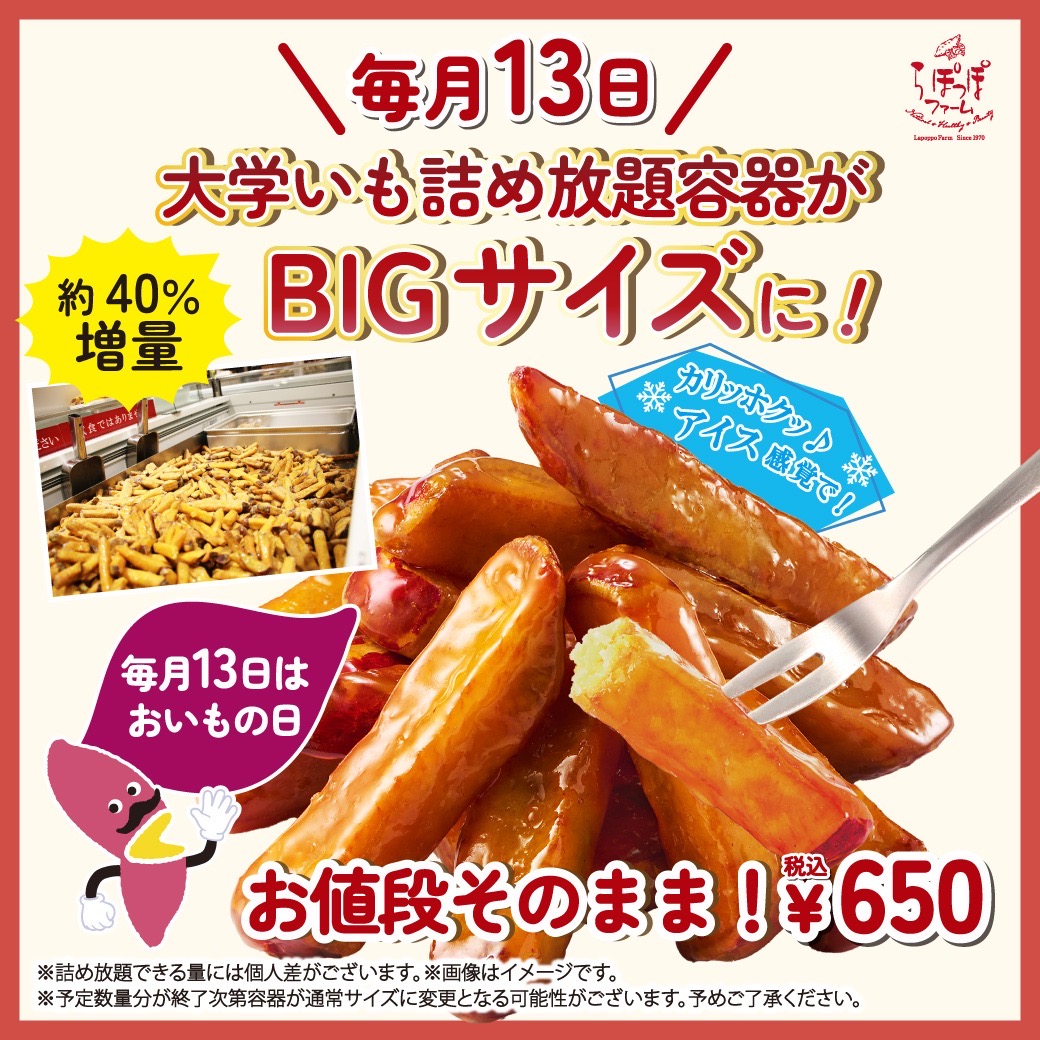 茨城県行方市にある「らぽっぽ なめがたファーマーズヴィレッジ」では、人気の「大学いも詰め放題コーナー」の容器が毎月13日限定でお値段そのままBIGサイズに!約40%増量のお得なキャンペーンを開催いたします。